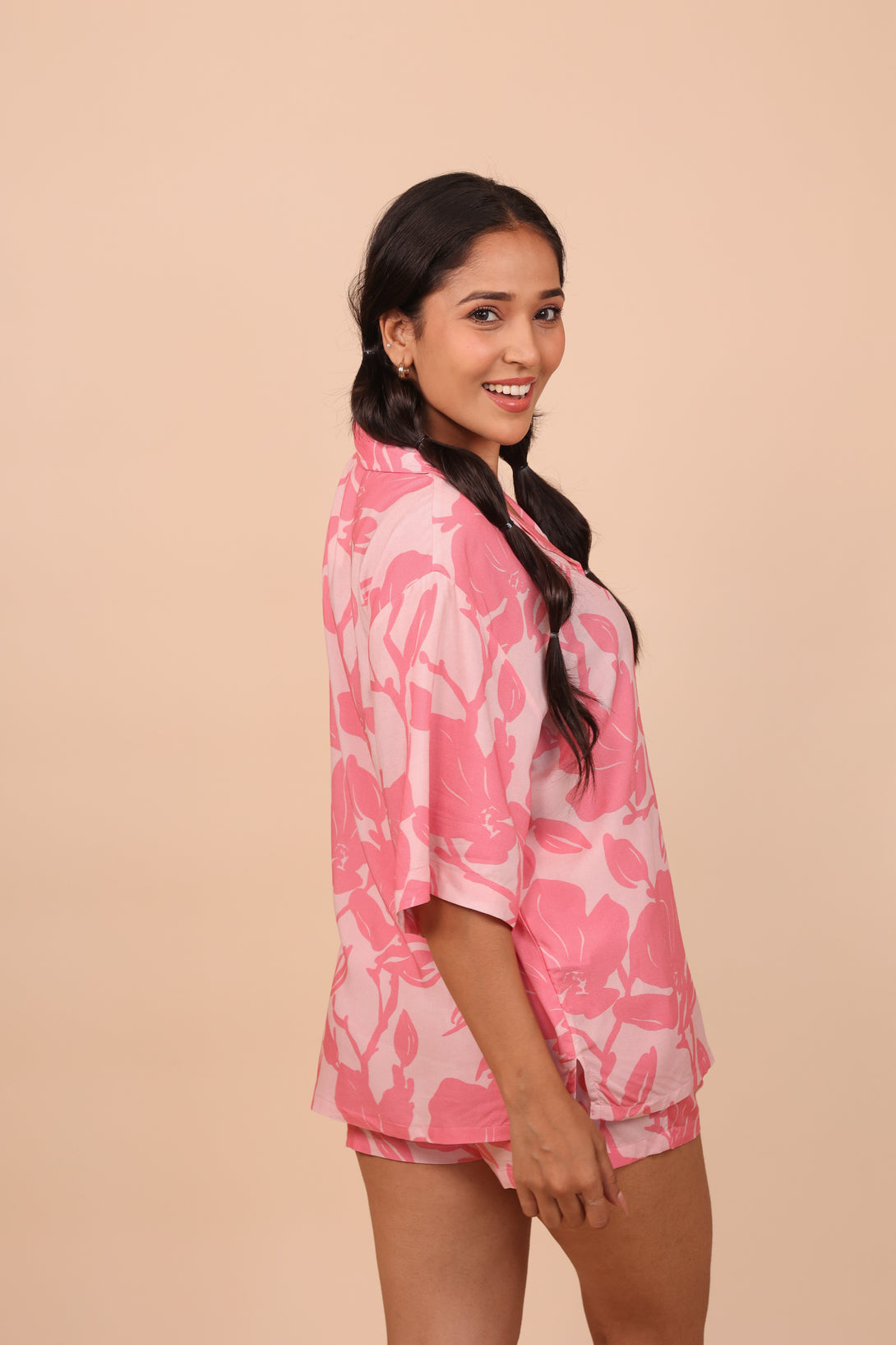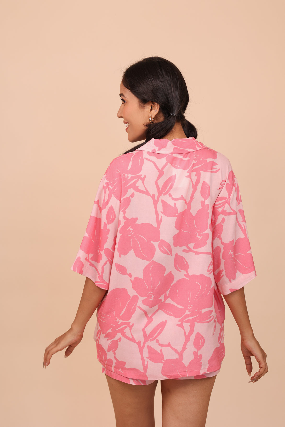 This two-piece set includes a loose-fit shirt and shorts made from soft, breathable rayon fabric. The shirt features a resort collar, a button-down front, gently dropped shoulders, and elbow-length sleeves. It has a straight-cut hem with small side slits for ease. The bottoms have a covered elastic waistband and discreet side pockets, offering a relaxed yet flattering silhouette.