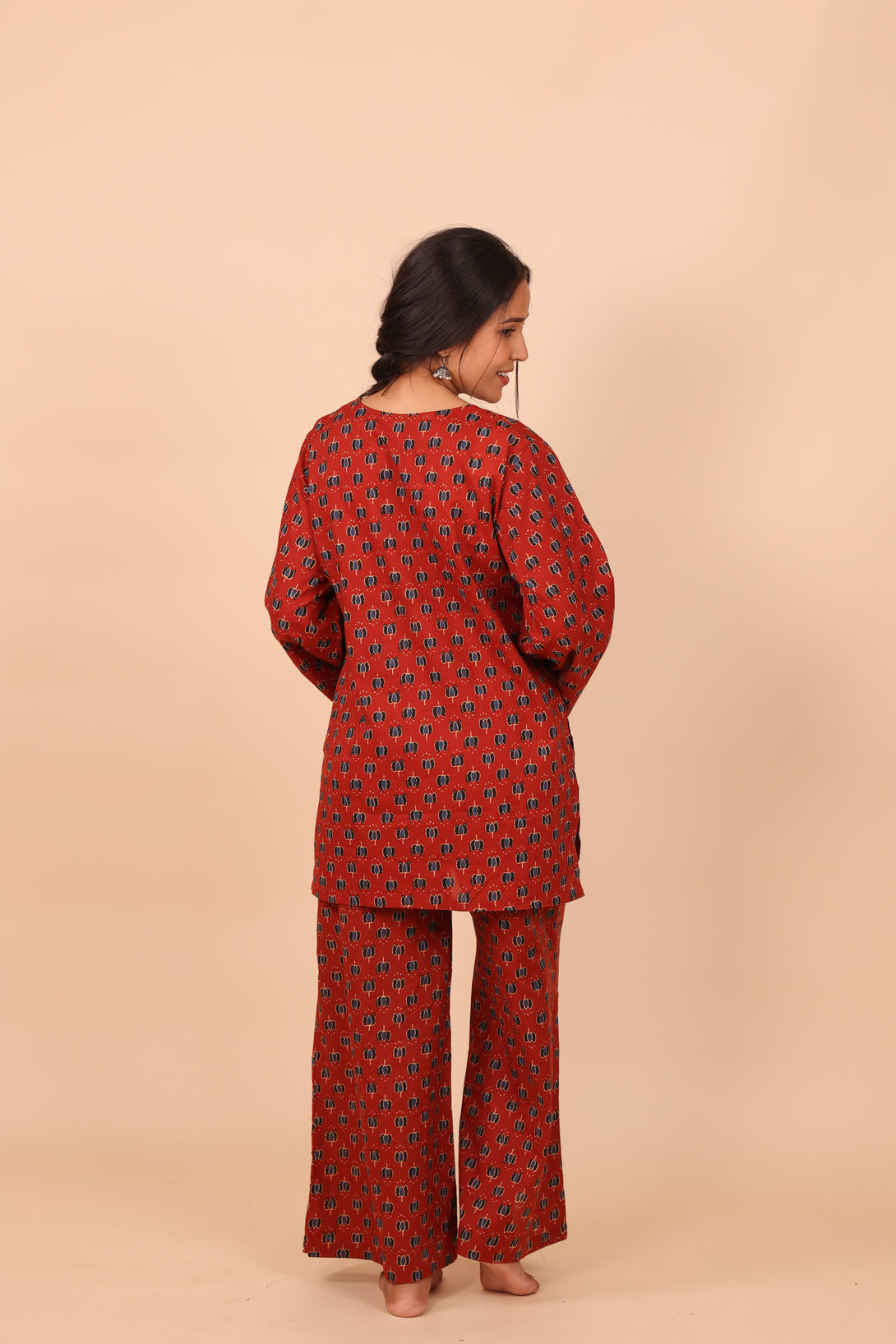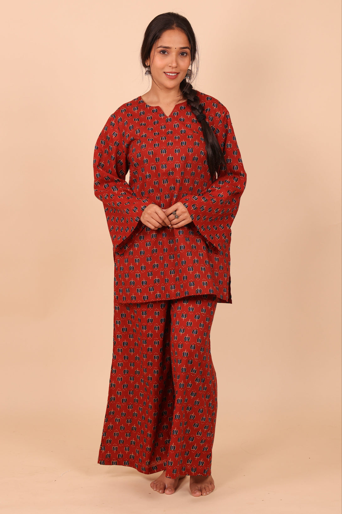 Crafted from 100% pure cotton, this breathable beauty features a straight-fit kurta with soft, flared sleeves that bring just the right touch of drama. The bottoms are wide-legged and flowy — think relaxed A-line with extra ease — finished with an elasticated waistband and (of course) pockets. Because comfort should never mean compromise.