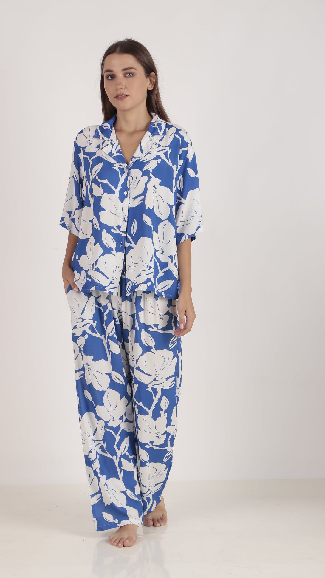 This two-piece set includes a loose-fit shirt and pajamas made from soft, breathable rayon fabric. The shirt features a resort collar, a button-down front, gently dropped shoulders, and elbow-length sleeves. It has a straight-cut hem with small side slits for added ease. The bottoms have a covered elastic waistband, discreet side pockets, and a wide-leg design, offering a relaxed yet flattering silhouette.