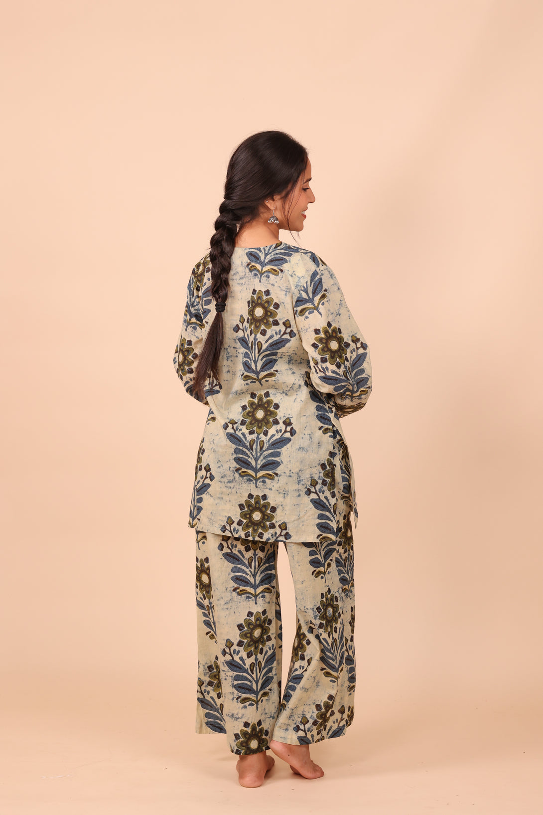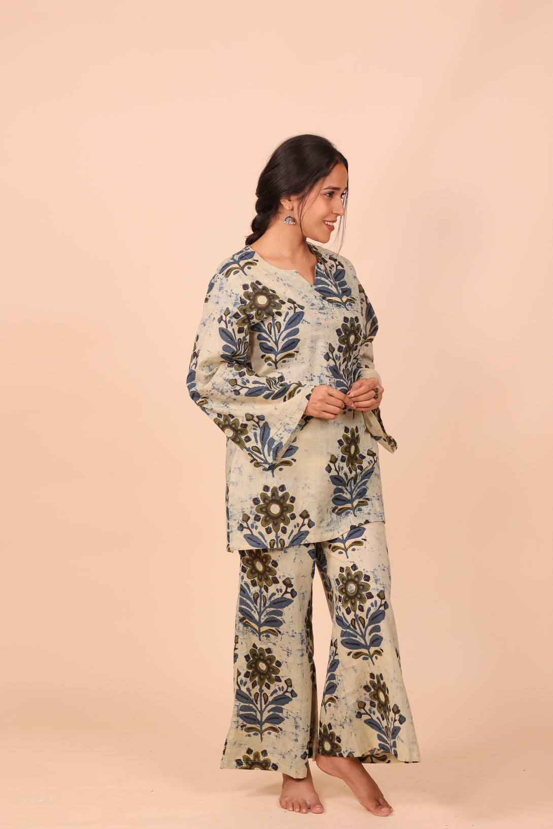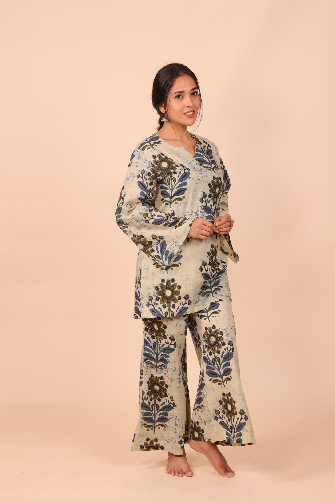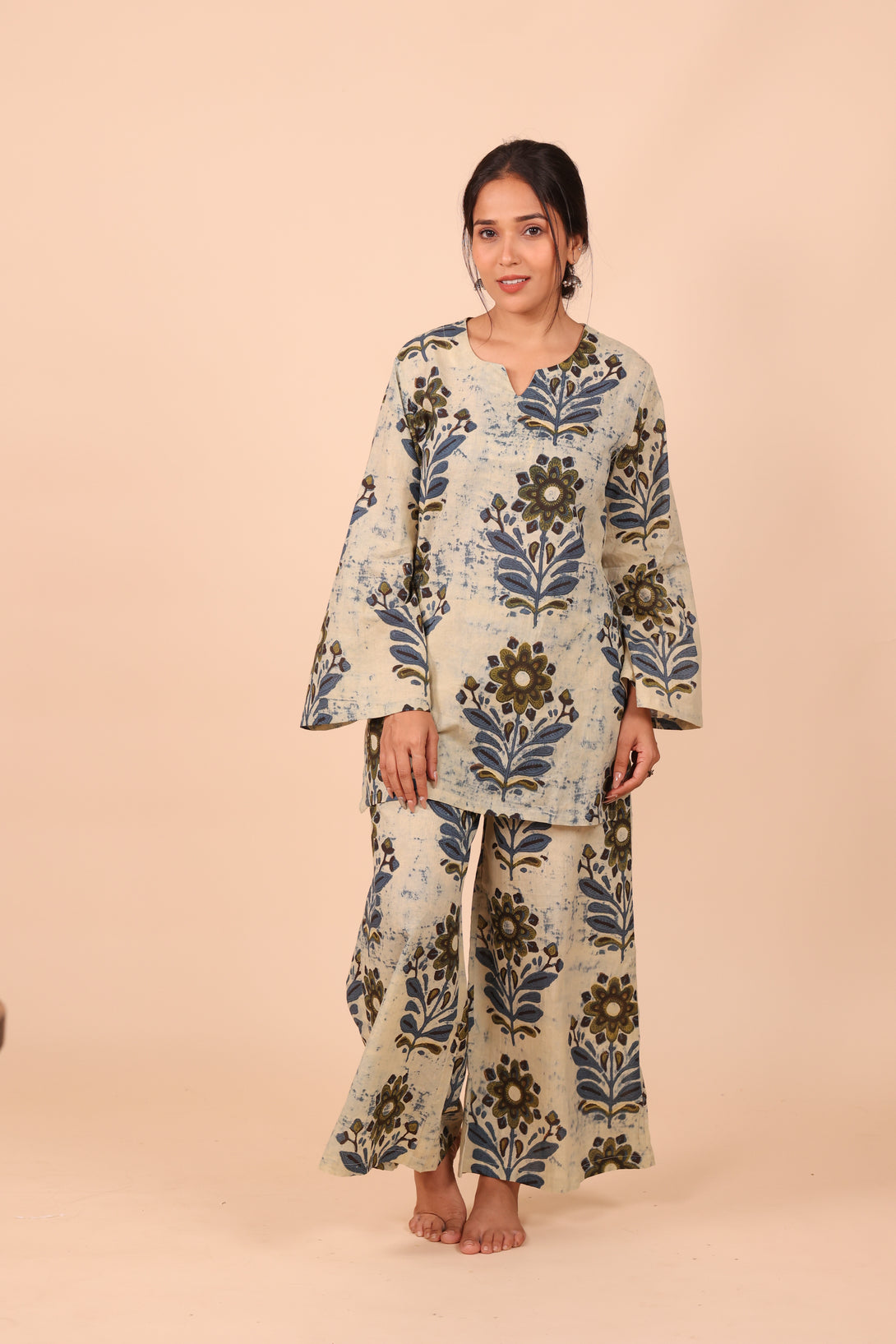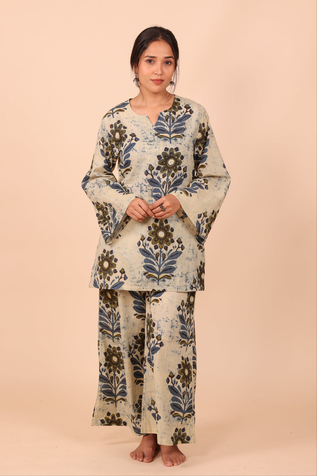Crafted from 100% pure cotton, this breathable beauty features a straight-fit kurta with soft, flared sleeves that bring just the right touch of drama. The bottoms are wide-legged and flowy — think relaxed A-line with extra ease — finished with an elasticated waistband and (of course) pockets. Because comfort should never mean compromise.