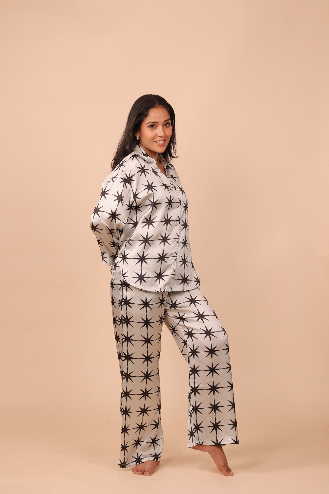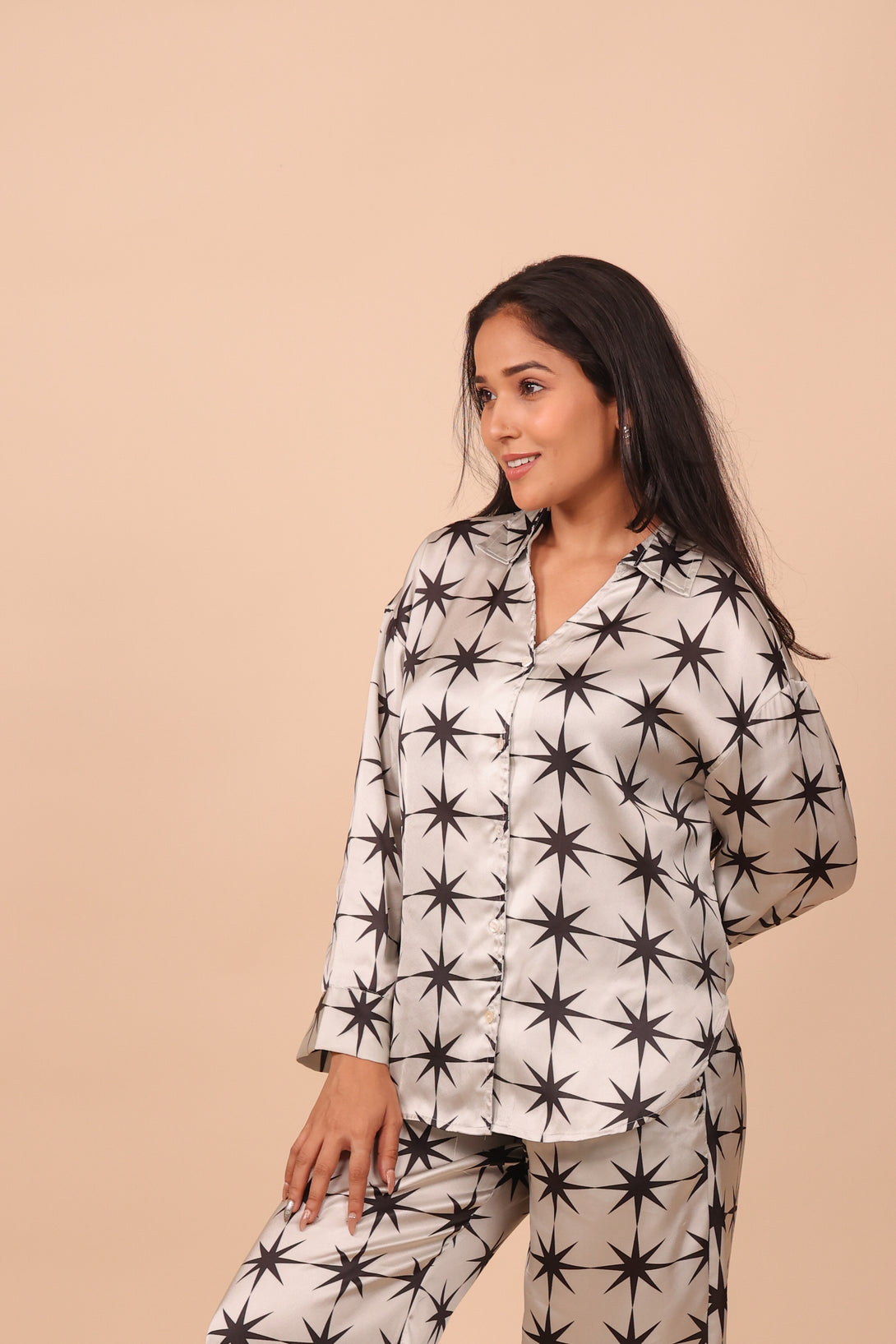 Get ready to feel like a million bucks (without spending it) in our satin touch oversized shirt and pajama set. This set features a luxurious satin finish that's smoother than a well-rehearsed pickup line. The oversized shirt exudes effortless elegance, making you look like you woke up like this (flawless). And the matching bottoms? They're so cozy, you'll swear they were woven with a hug. This set promises a luxurious experience that's as comfy as it is chic.